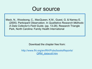 There are more data sources than ever. Three of the most popular methods are: In this example, the researcher can observe and record the details objectively. The last are the conclusions and . In this study, the researcher gathered the data by . The researcher uses observation as a scientific . Research, the researcher uses qualitative data analysis. Observation is the process of watching someone or something. The observation method is mostly used in studies related to behavioral science. Raw data typically refers to data tables where rows contains observations and columns represent a variable that describes some property of each observation. Often, observation is an informal action, but it can also be formal and involve data collection . There are many methods used to collect or obtain data for statistical analysis. Field reports facilitate the development of data collection techniques and observation skills and they help you to understand how theory applies to real world .